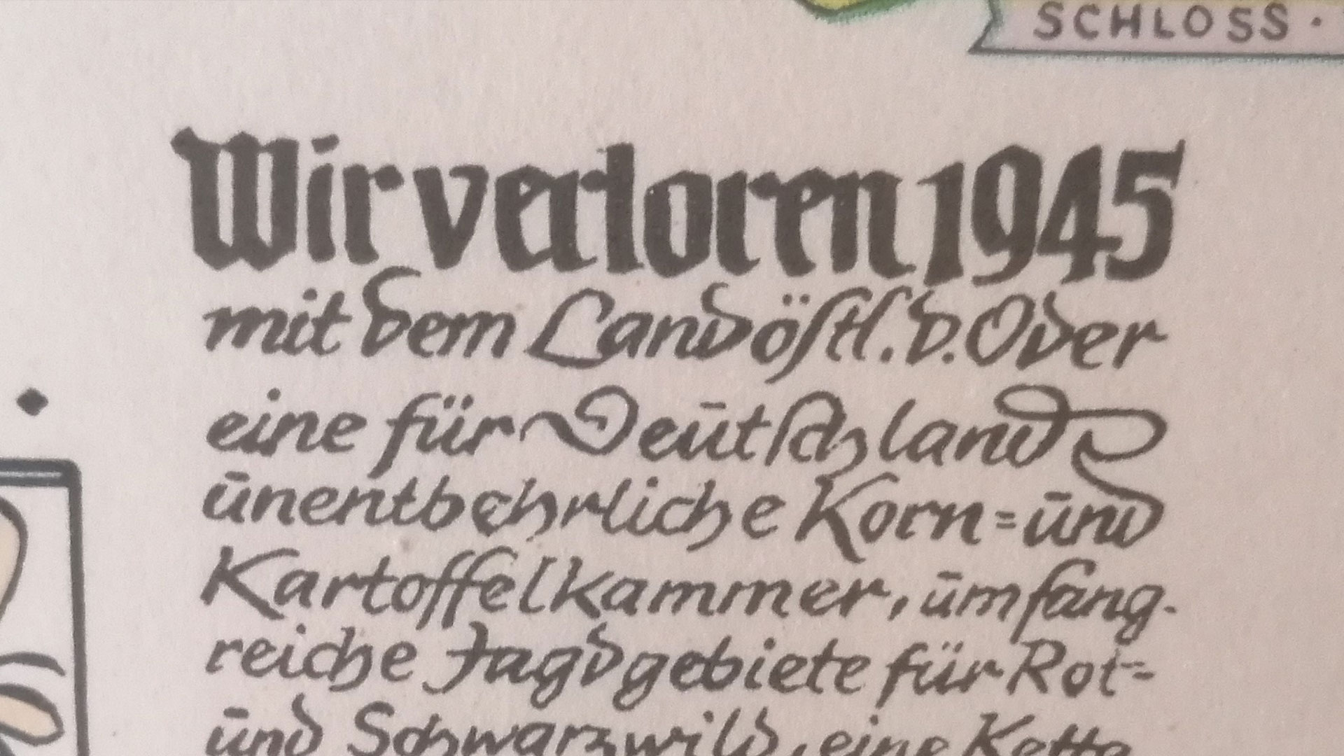 Bild 4: „Was wir verloren haben, darf nie verloren sein.“ Das ist die politische Botschaft, die diese Karte präsentiert: Der Verlust der deutschen Ostgebiete sei ein Unrecht und müsse wieder Rückgängig gemacht werden. Diese Revisionshaltung ist heute nicht mehr gesellschaftlich akzeptiert.