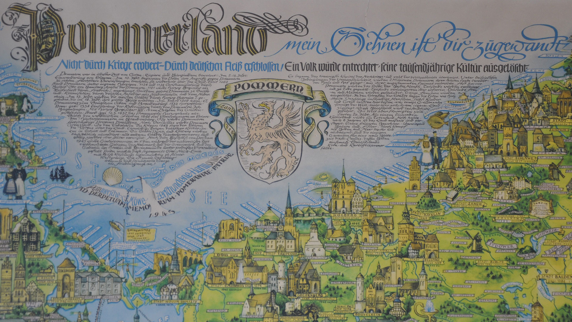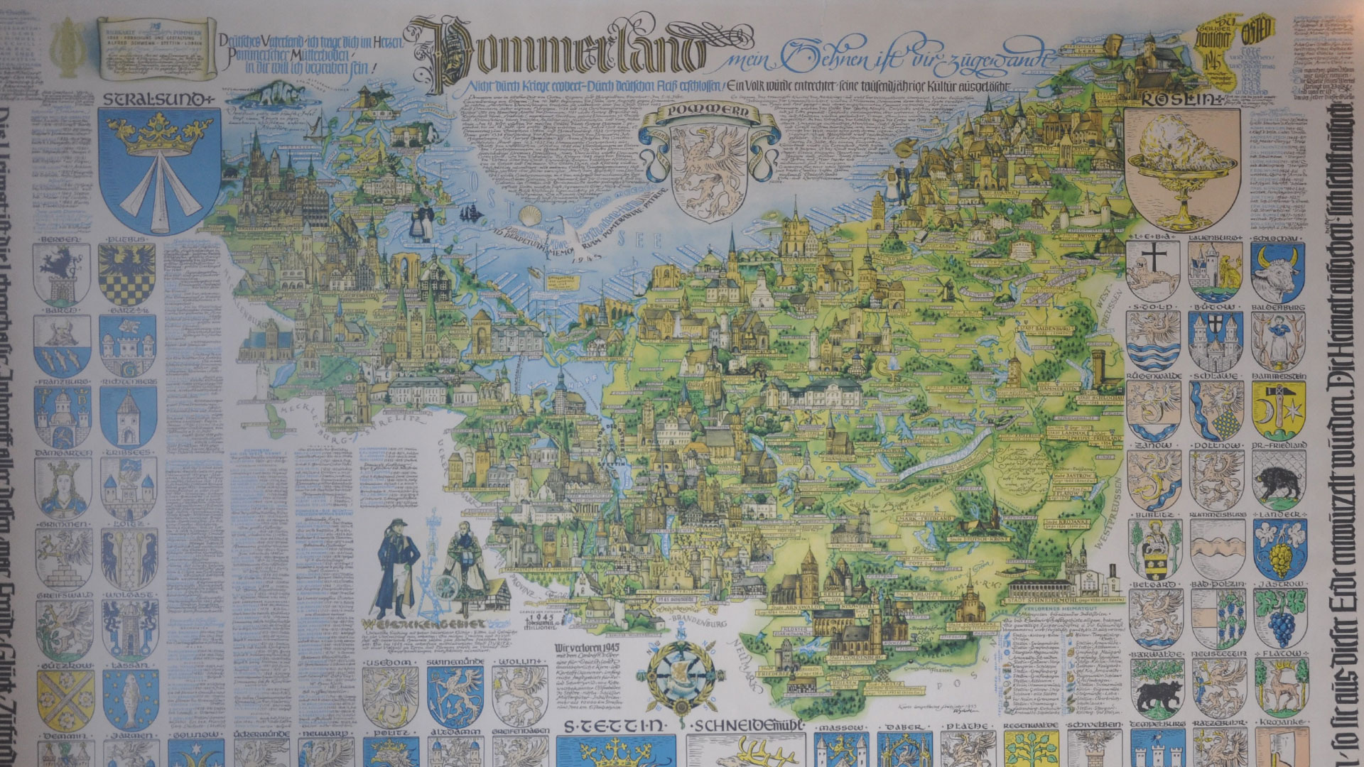 Bild 1: Ein besonderes Ausstellungsstück ist eine „Heimatkarte“ aus dem Jahr 1951. Auf ihnen ist die Region Pommern in freundlichen Farben abgebildet und mit zahlreichen Piktogrammen bedeutender Orte, naturräumlicher Gegebenheiten, sowie auch industrielle und landwirtschaftliche Produkte, die die jeweiligen Landstriche prägten, verziert. Auch die Wappen der Städte und Gemeinden der Region schmückt diese Karten. In kurzen Texten wird der Verlust Pommerns beklagt und gefordert, dass es wieder zu Deutschland gehören müsse. Diese Art der Darstellung ist problematisch. Sie zeigt dem Betrachtenden eine idyllische Vergangenheit, die von den „Vertreiberstaaten" im Zweiten Weltkrieg angeblich zerstört wurde. Dadurch entsteht eine unterschwellige Vorwurfshaltung. Zudem wird die Grenzziehung zwischen Deutschland und Polen nach dem Zweiten Weltkrieg an Oder und Neiße in Frage gestellt. Heute ist dieser Grenzverlauf von allen Staaten anerkannt und kein Gegenstand politischer Diskussionen mehr. Die Galerie zeigt die Karte und einige Ausschnitte im Detail.
