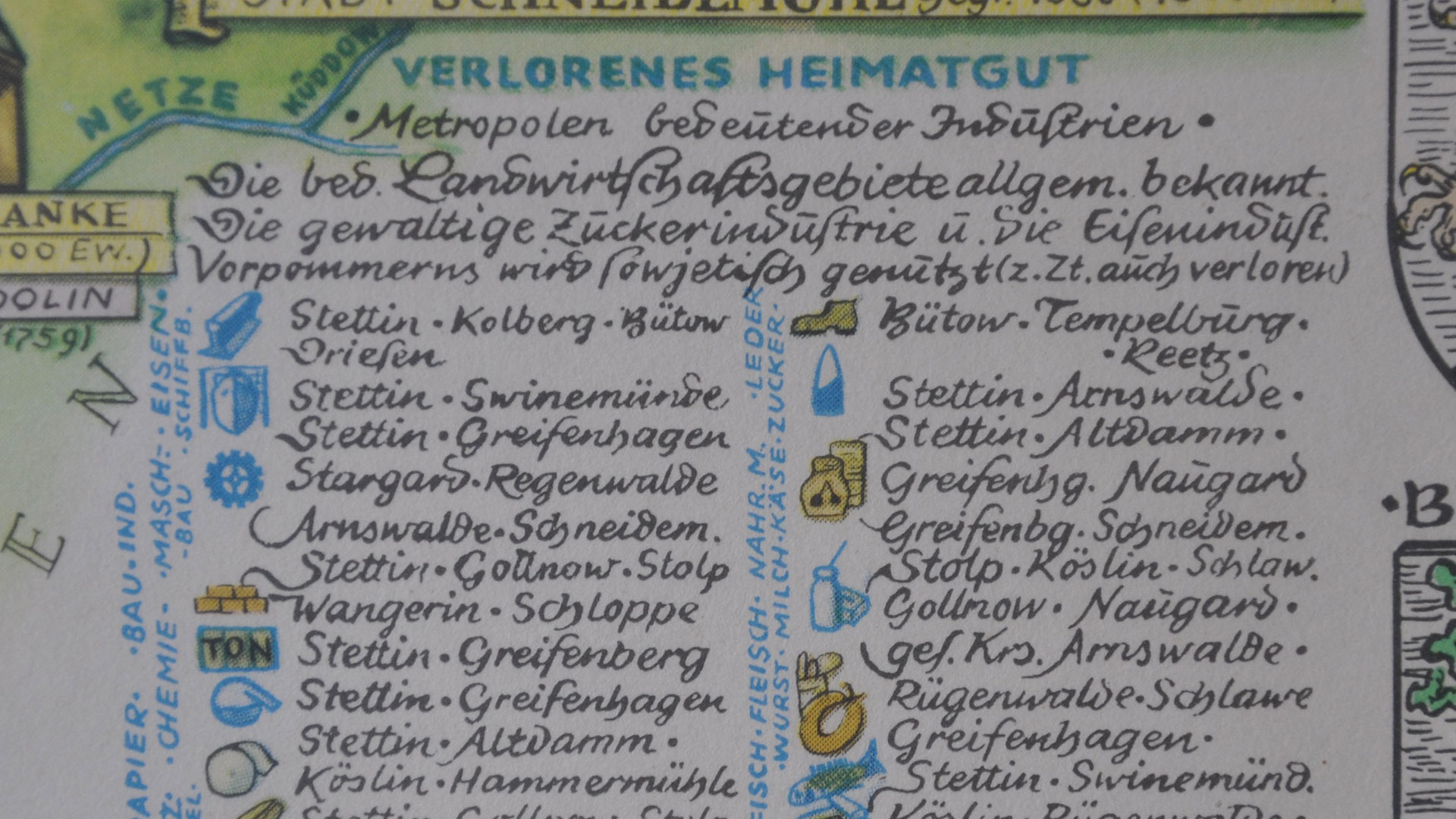 Bild 3: Hier wird genauestens aufgeführt, welche „bedeutende Industrien“ in Pommern für Deutschland verloren gingen. Es scheint, als hätten die „bedeutenden Industrien" unter den neuen Bewohnerinnen und Bewohnern der Region keine Gegenwart. Deshalb ist diese Karte kritisch zu betrachten.