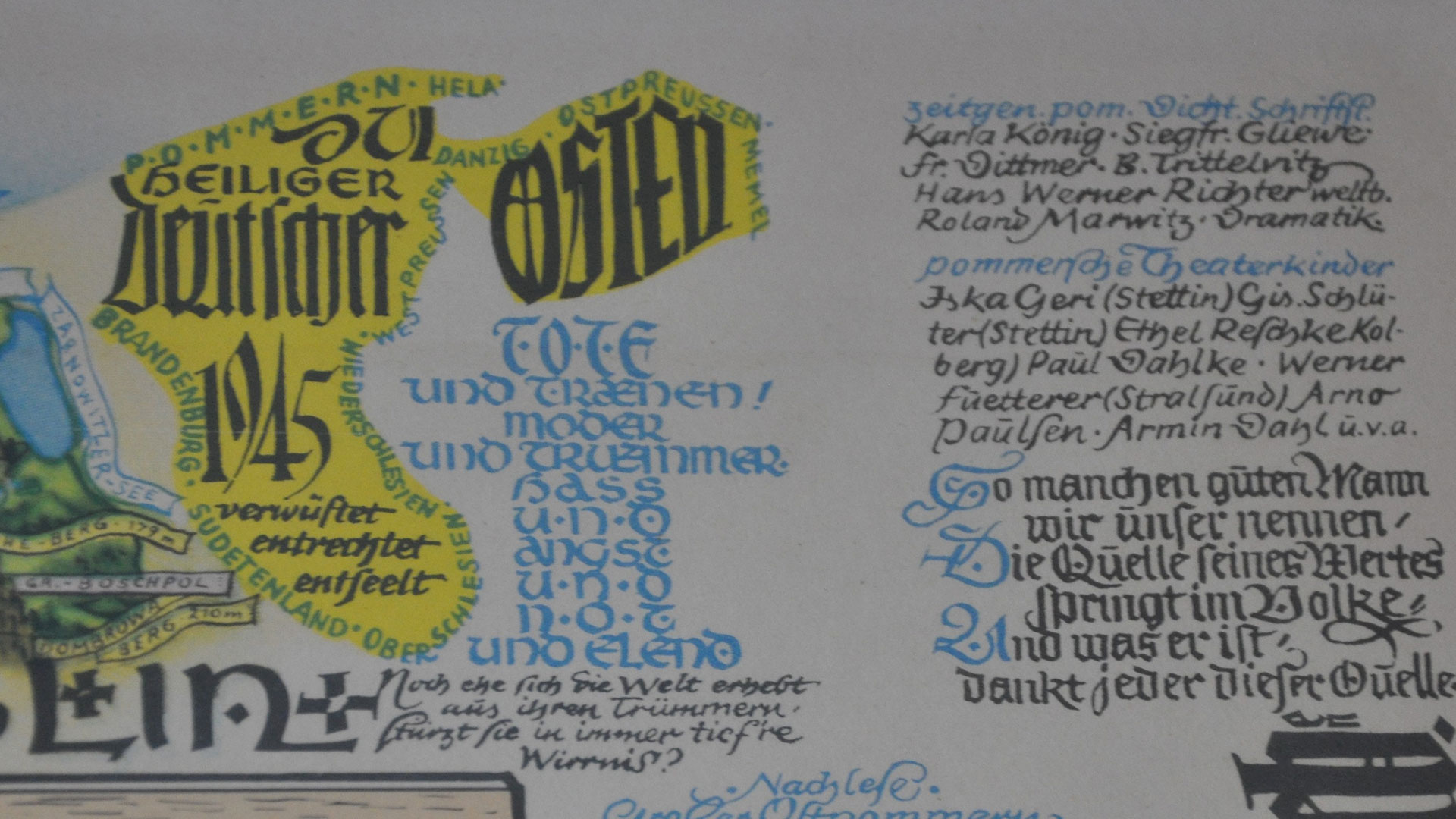 Bild 5: In diesem Ausschnitt wird die Abtretung der ehemaligen deutschen Ostgebiete als Unrecht dargestellt und die vermeintliche „Deutschheit“ der Gebiete betont. An der Seite werden berühmte aus Pommern stammende Persönlichkeiten aufgeführt, um den kulturellen Verlust zu verbildlichen. Es entsteht der Eindruck, dass eine Gegenwart unter den heutigen Bewohnerinnen und Bewohnern nicht existiert. Auch deshalb ist diese Karte kritisch zu betrachten.
